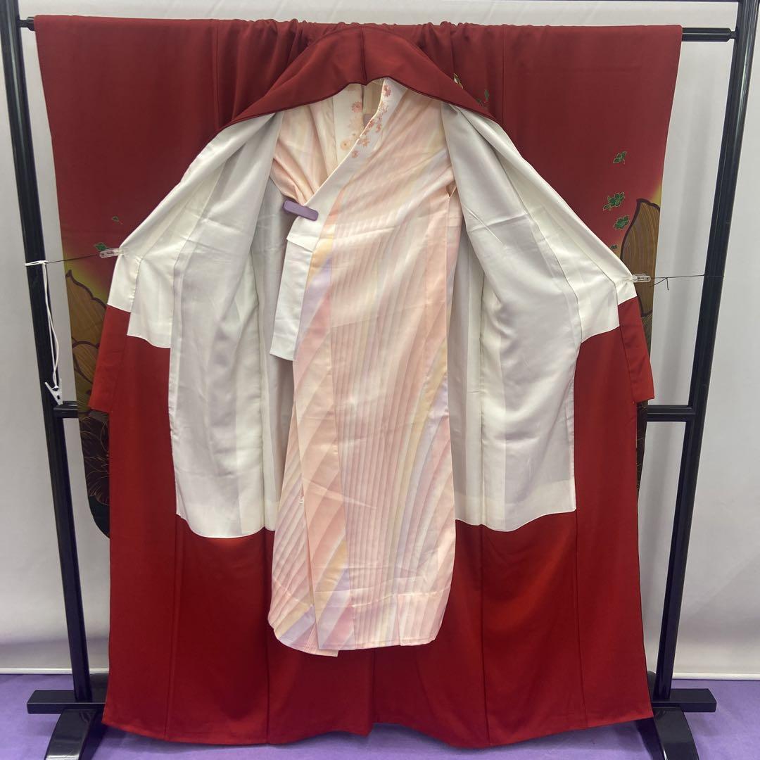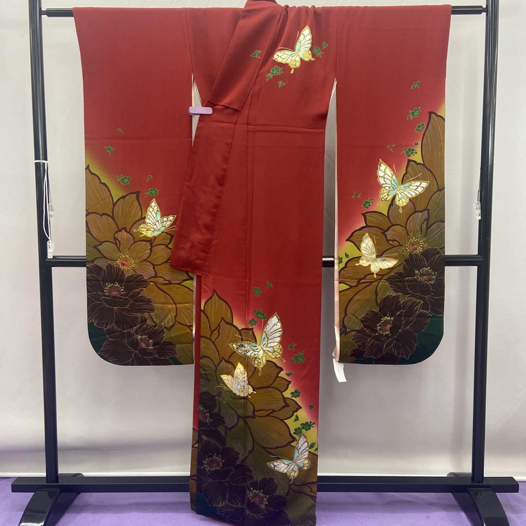 6178 臙脂色 振袖 着物 正絹 襦袢付き 蝶 着付け練習用