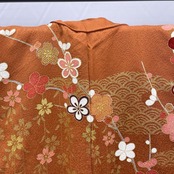 ・振袖は、茶みのある朱色~茶色の地色に、古典風の花柄です。