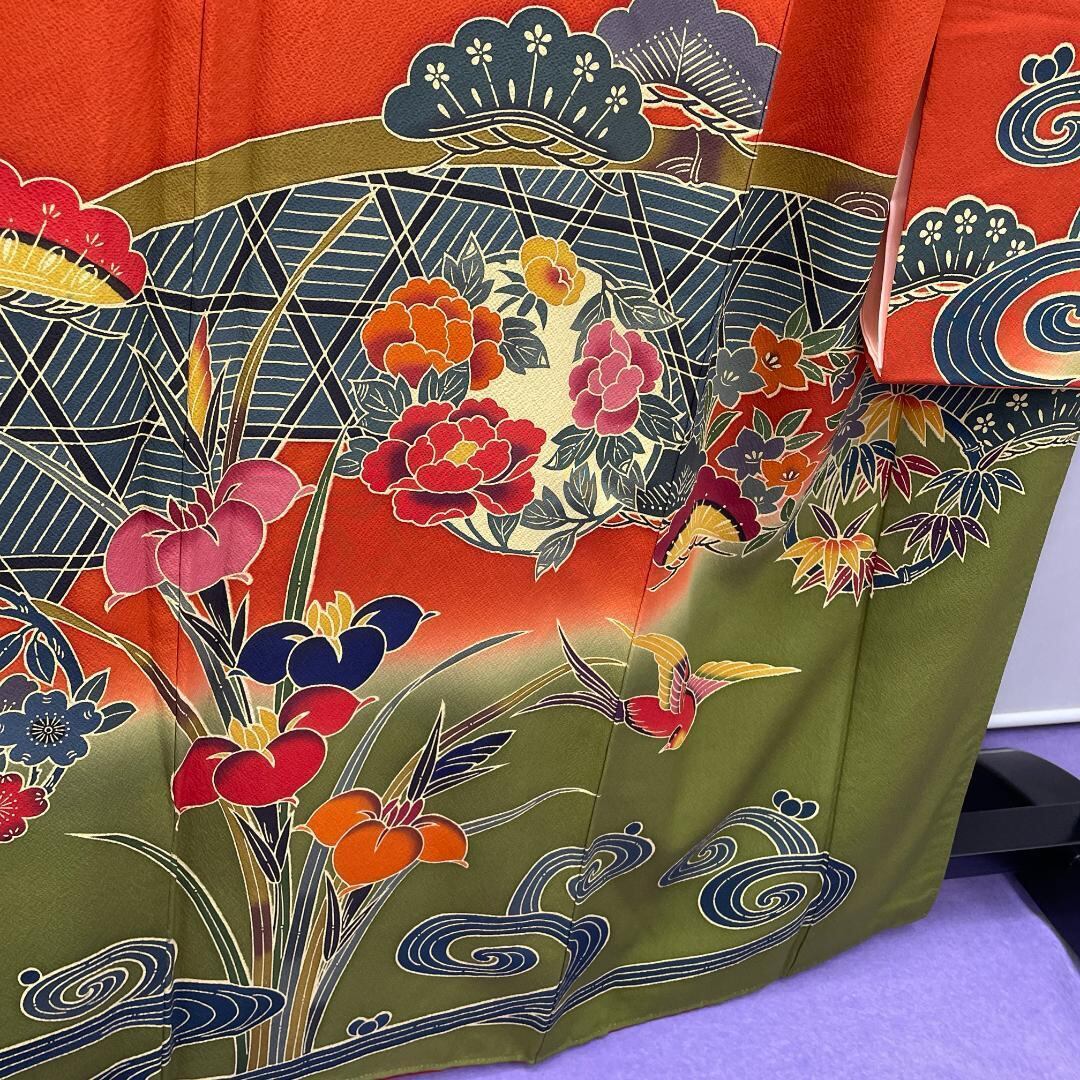 ★3262★ 振袖 赤茶色 暗い緑色 鳥 花柄 襦袢付き 着物セット