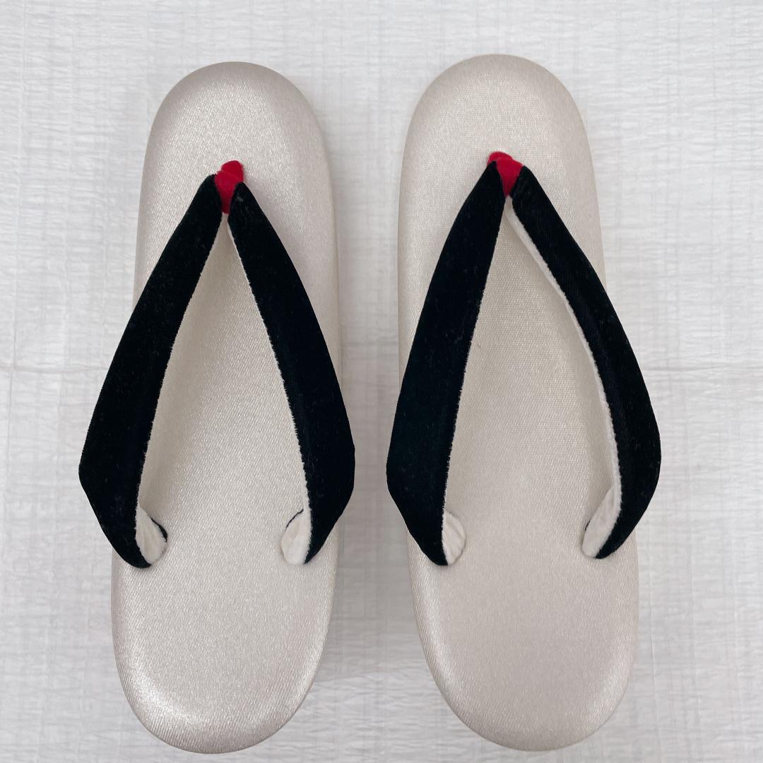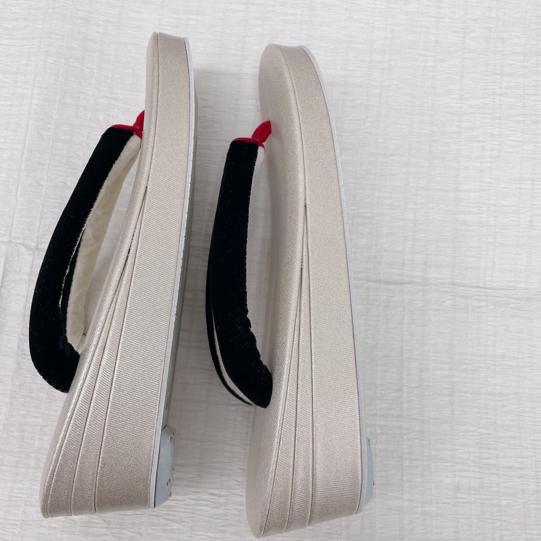 草履は、天やサイドは光沢のあるベージュ色、鼻緒は黒いベロア風と赤のワンポイントです。
