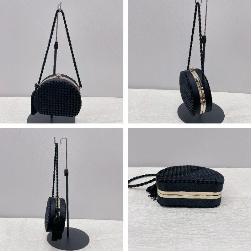 バッグは、丸い感じで、黒+光沢のある黒を織り込み、格子模様のような立体感を出している生地です。