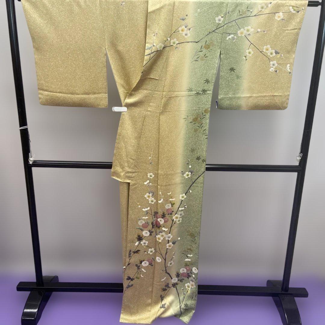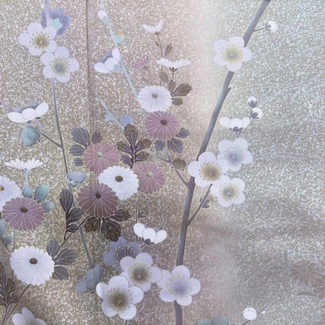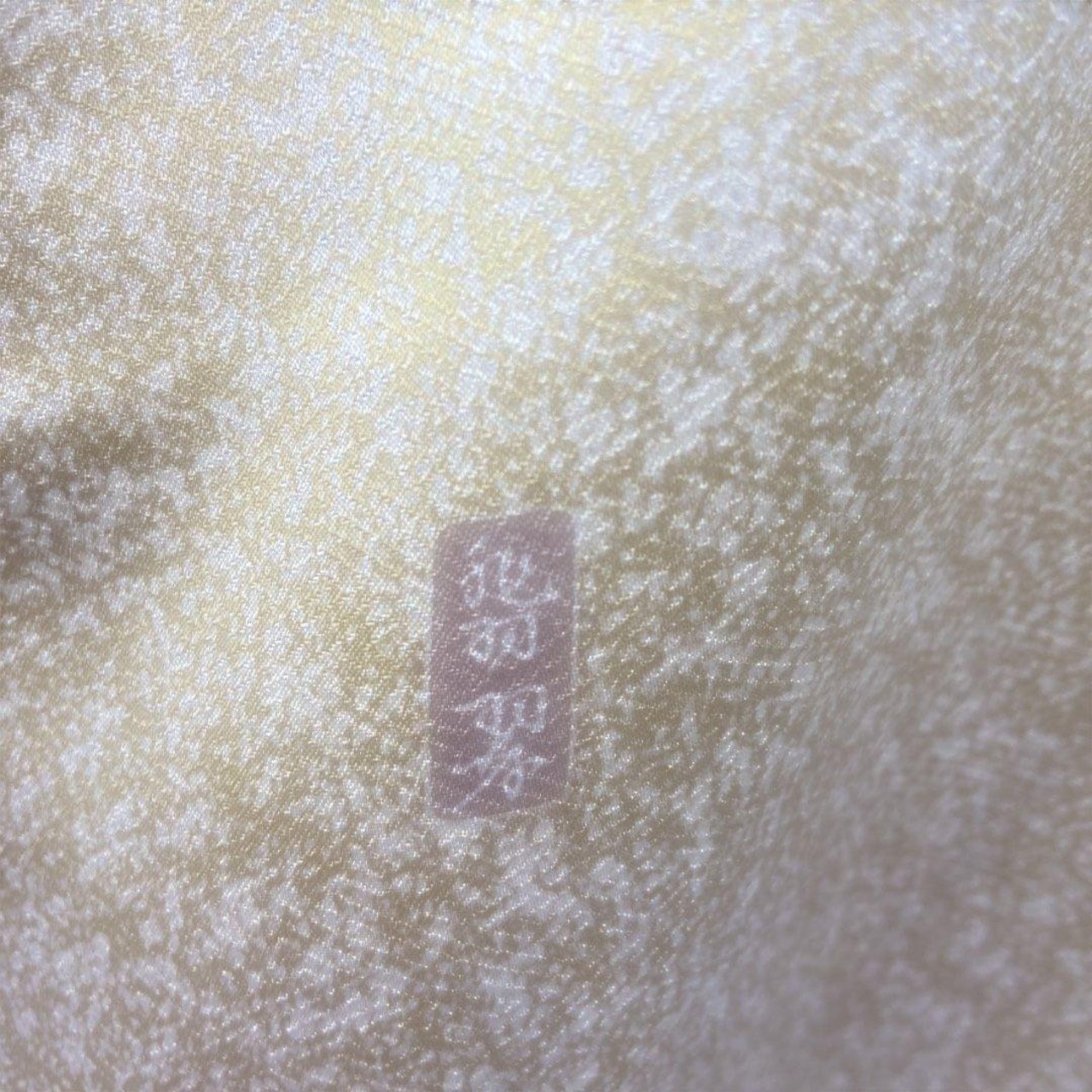 6589 ベージュ たたき染 訪問着 着物 正絹 梅 菊 桔梗 抹茶 落款