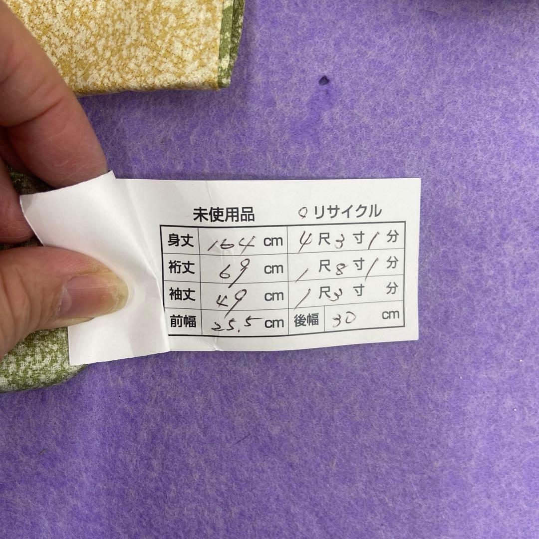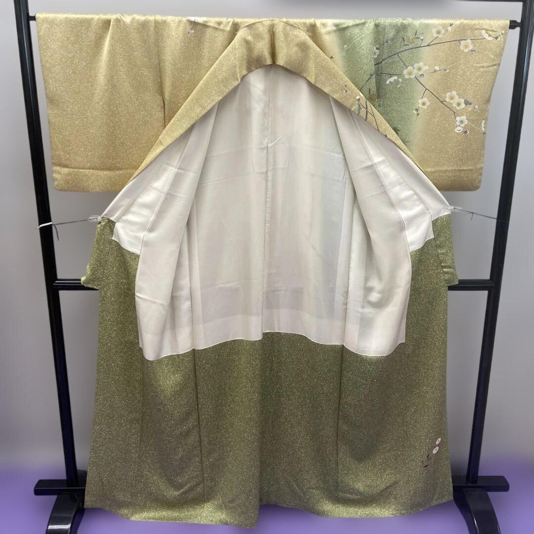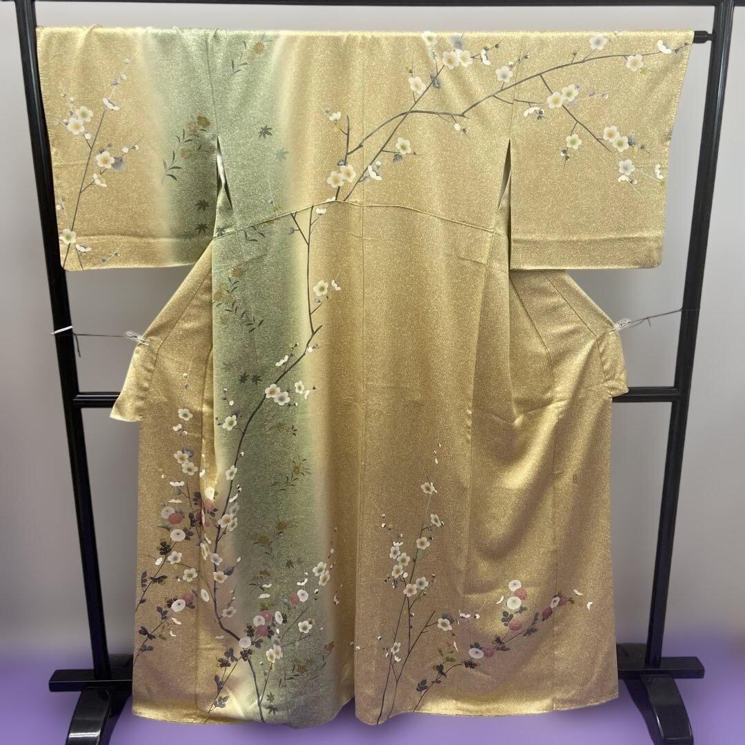 6589 ベージュ たたき染 訪問着 着物 正絹 梅 菊 桔梗 抹茶 落款