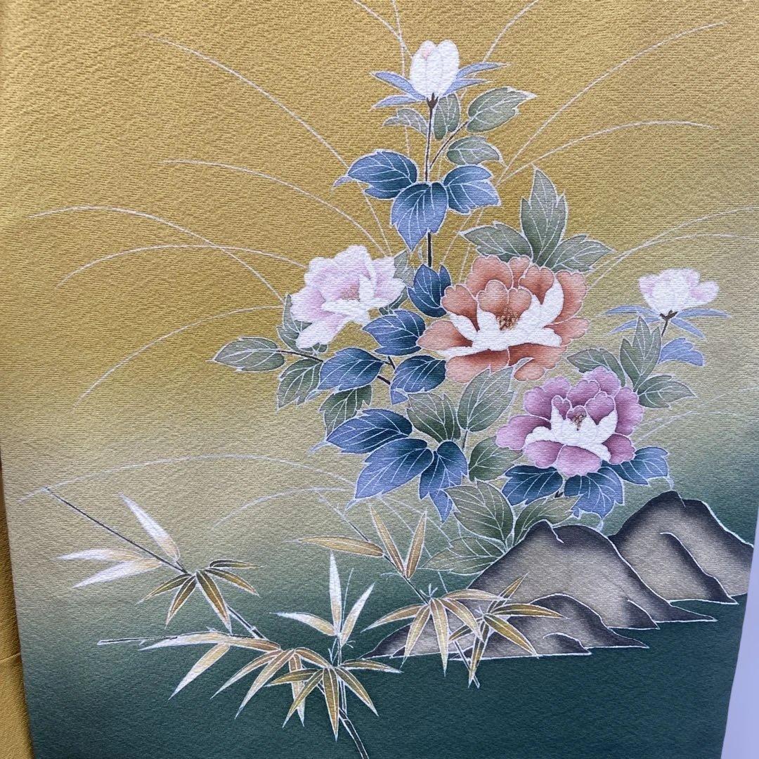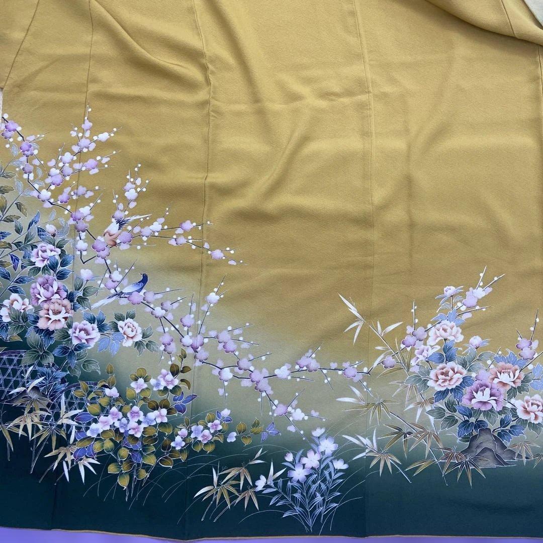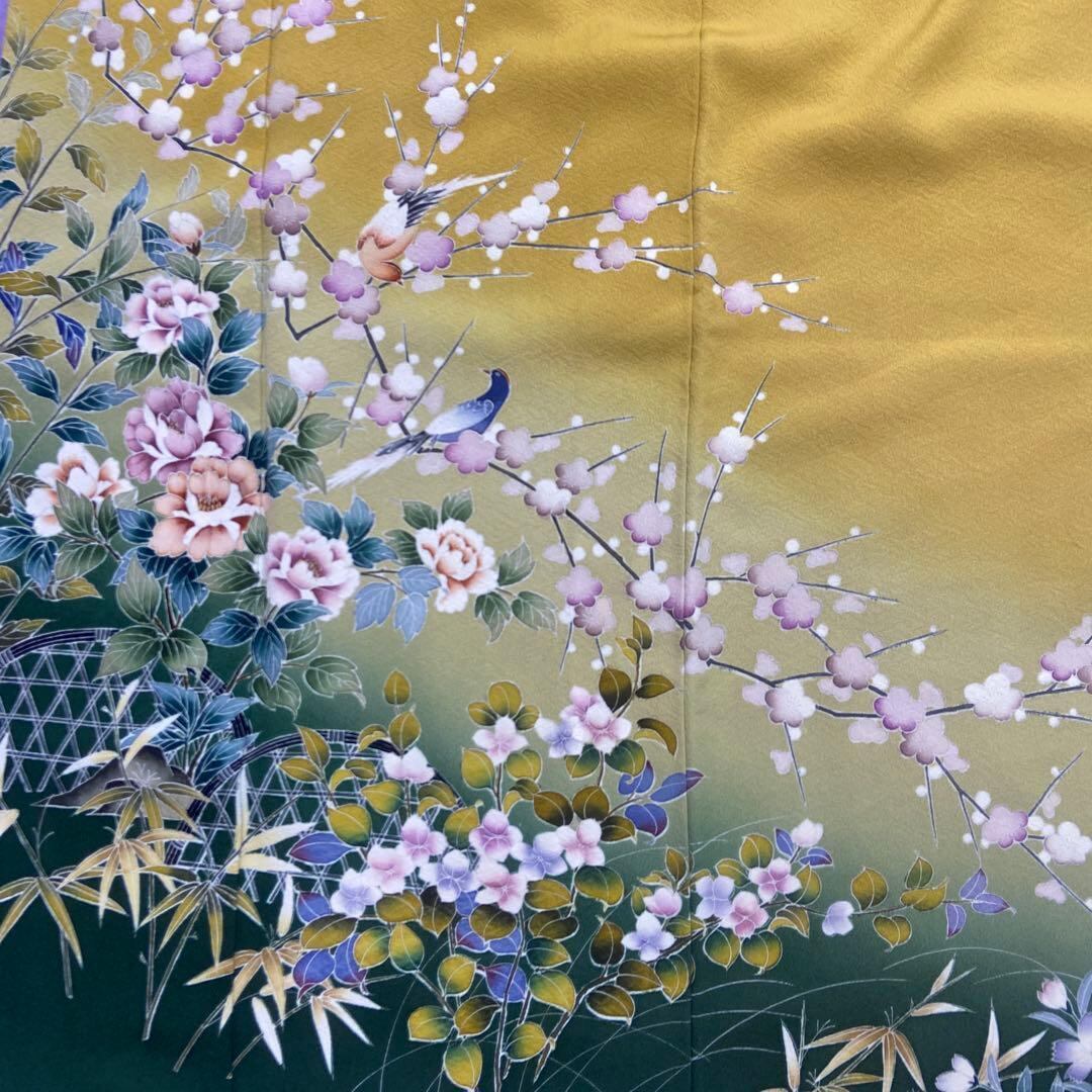 6591 狐色 深緑 訪問着 着物 正絹 梅 牡丹 竹 撫子 鳥