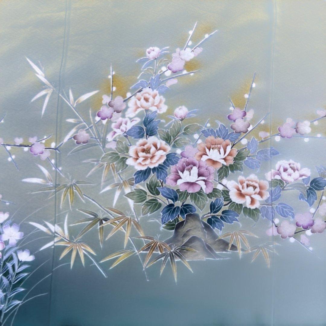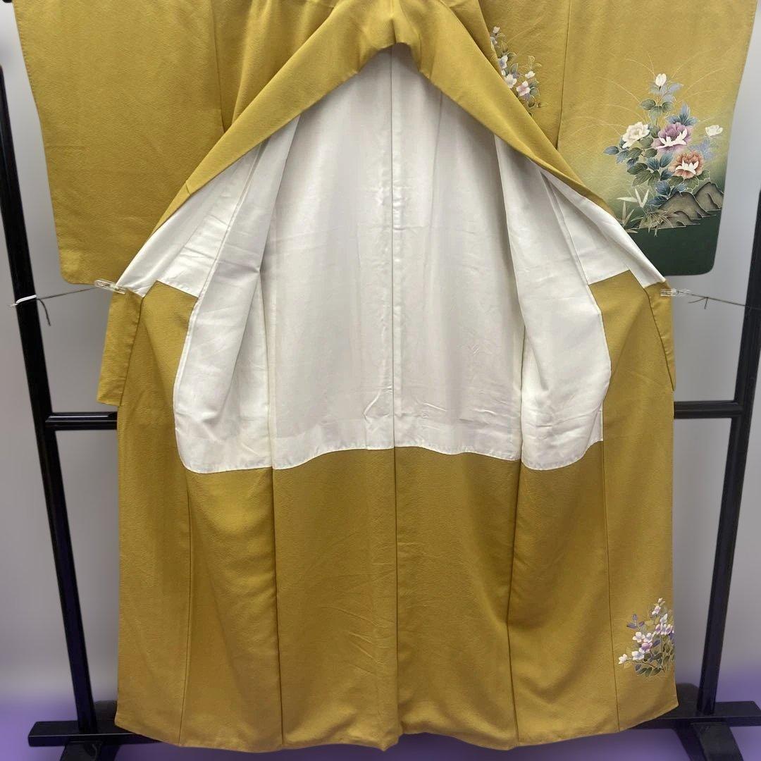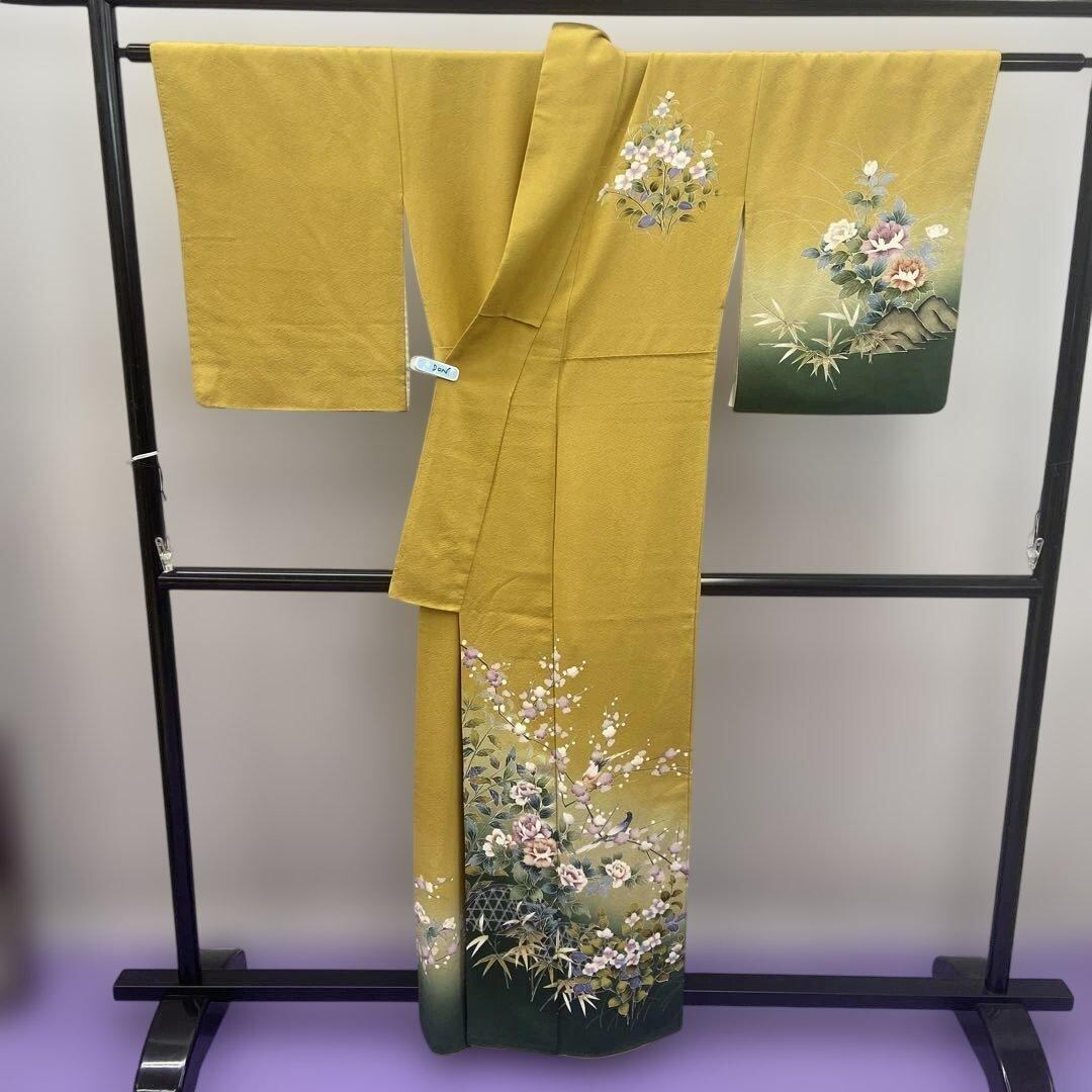 6591 狐色 深緑 訪問着 着物 正絹 梅 牡丹 竹 撫子 鳥