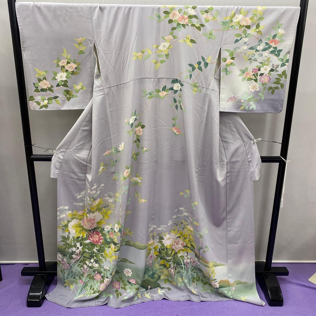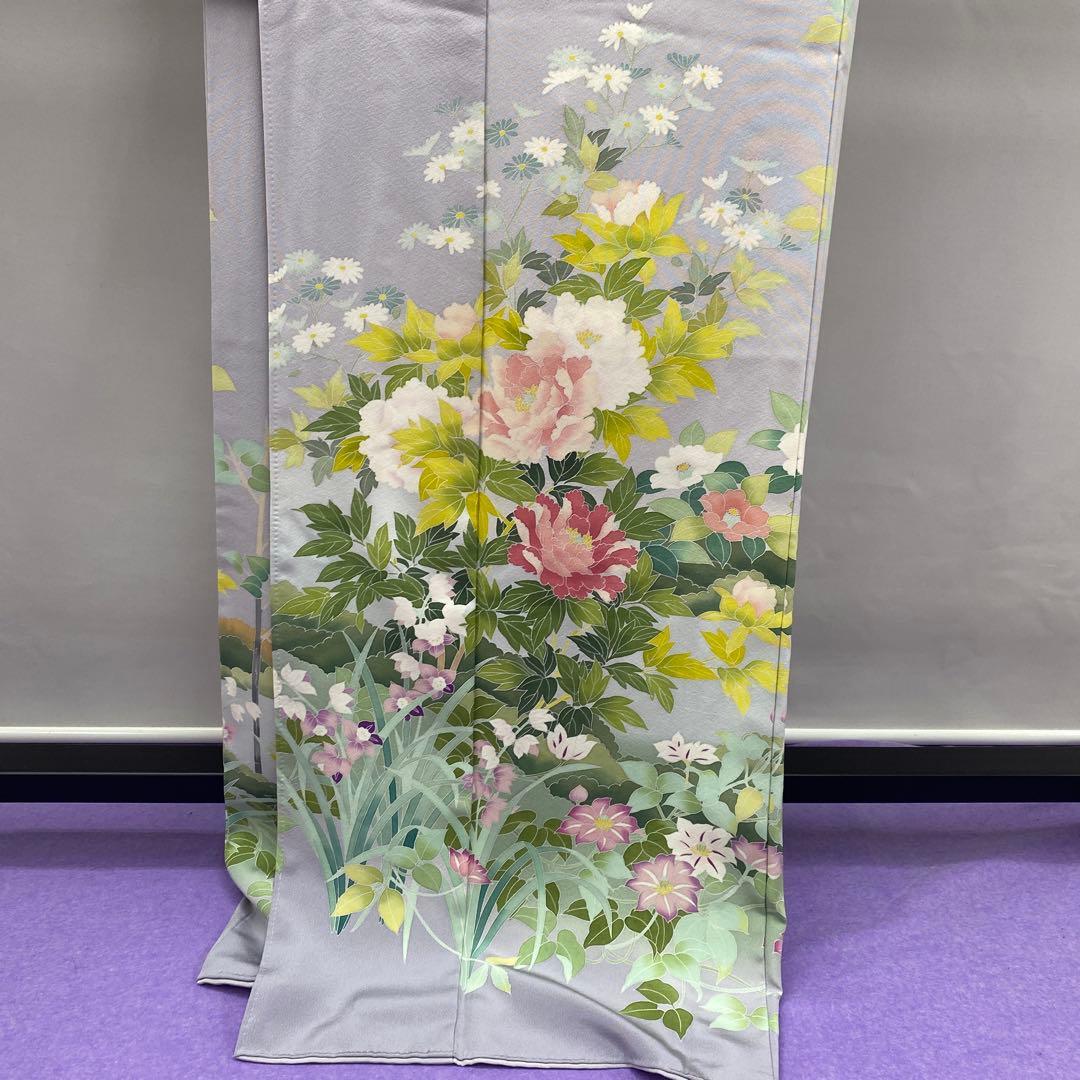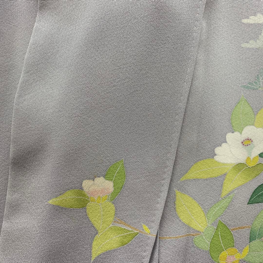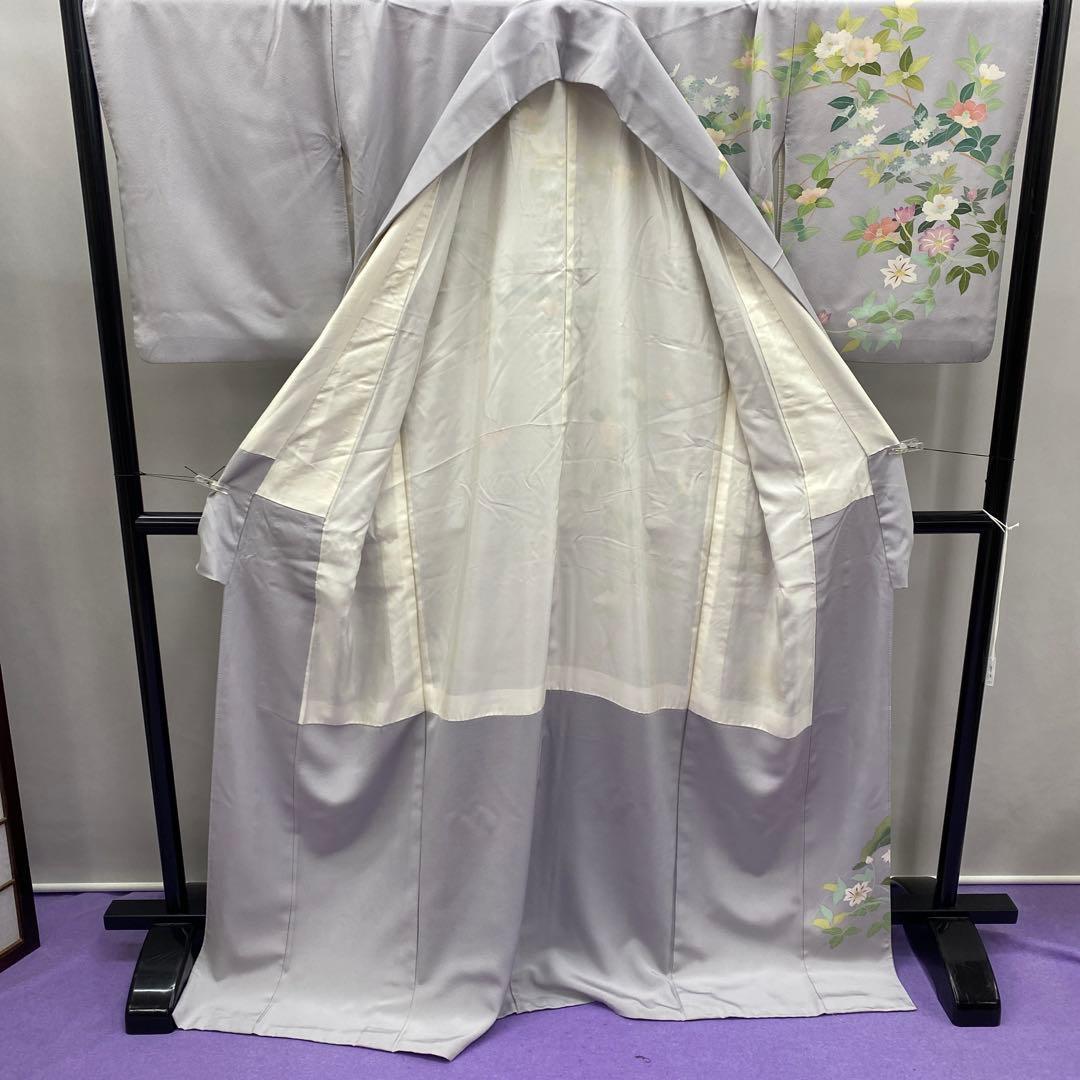 6742 訪問着 着物 正絹 薄灰紫 牡丹 椿 鉄扇 衿微か汚れ有り 落款有り