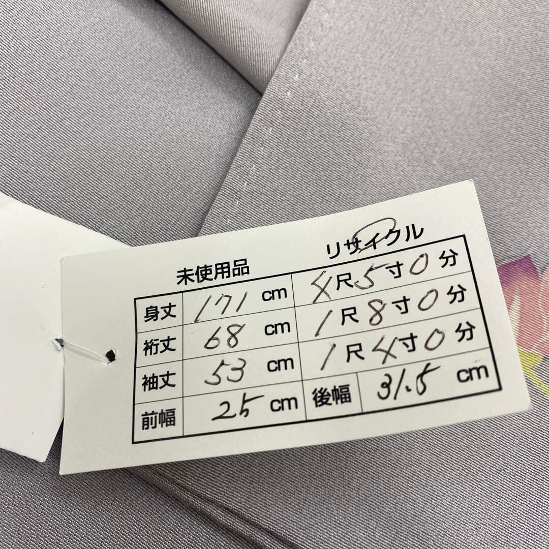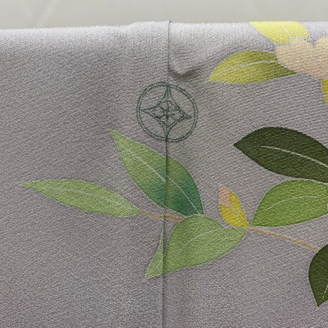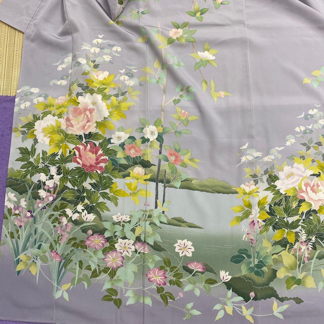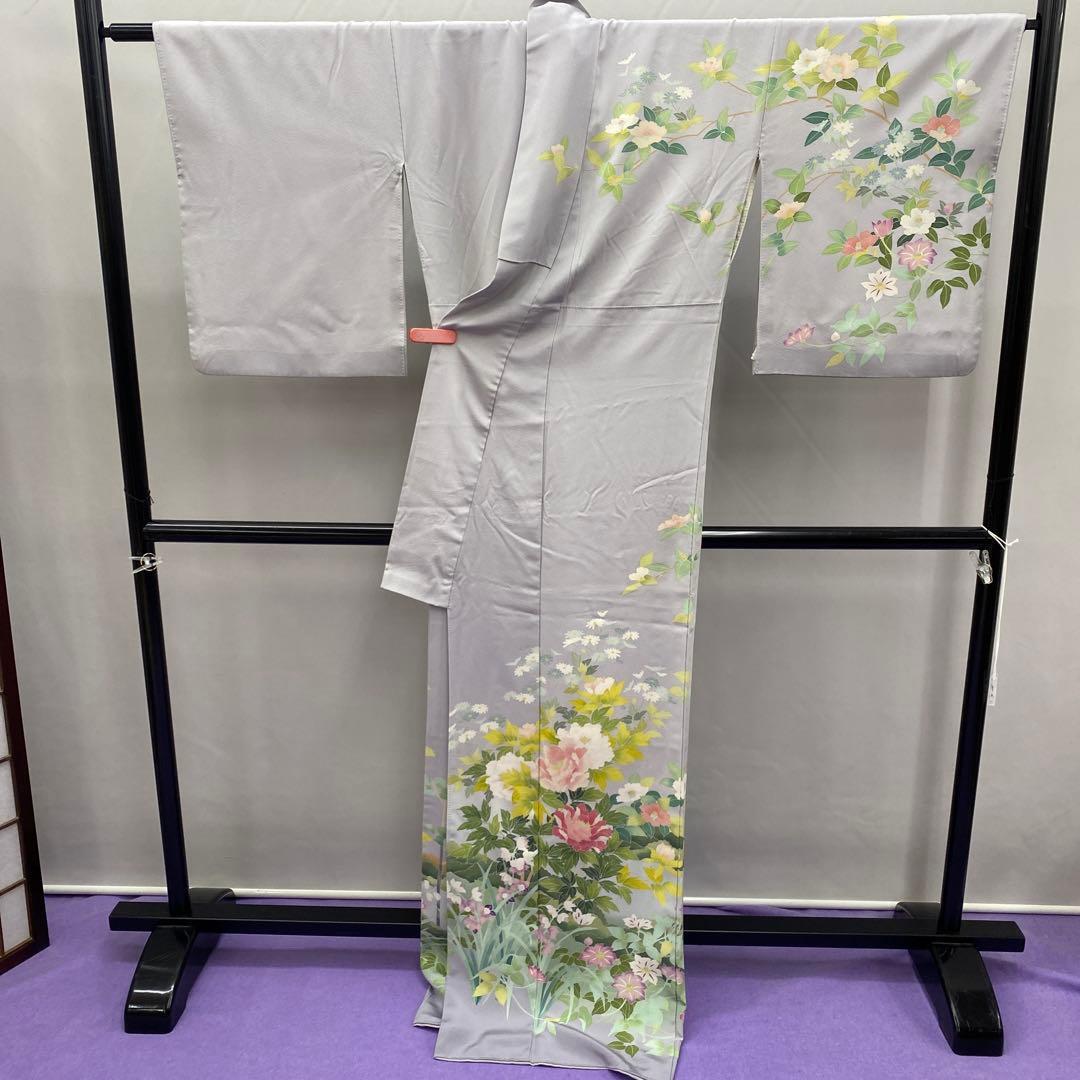 6742 訪問着 着物 正絹 薄灰紫 牡丹 椿 鉄扇 衿微か汚れ有り 落款有り