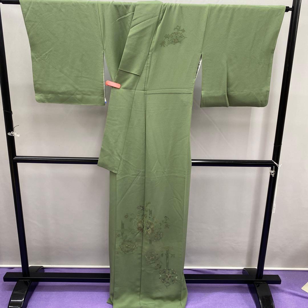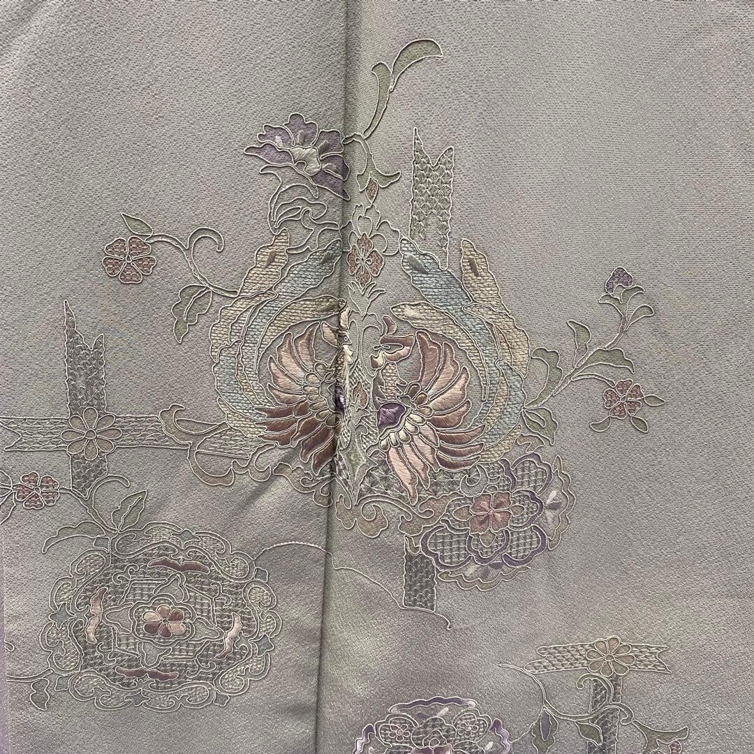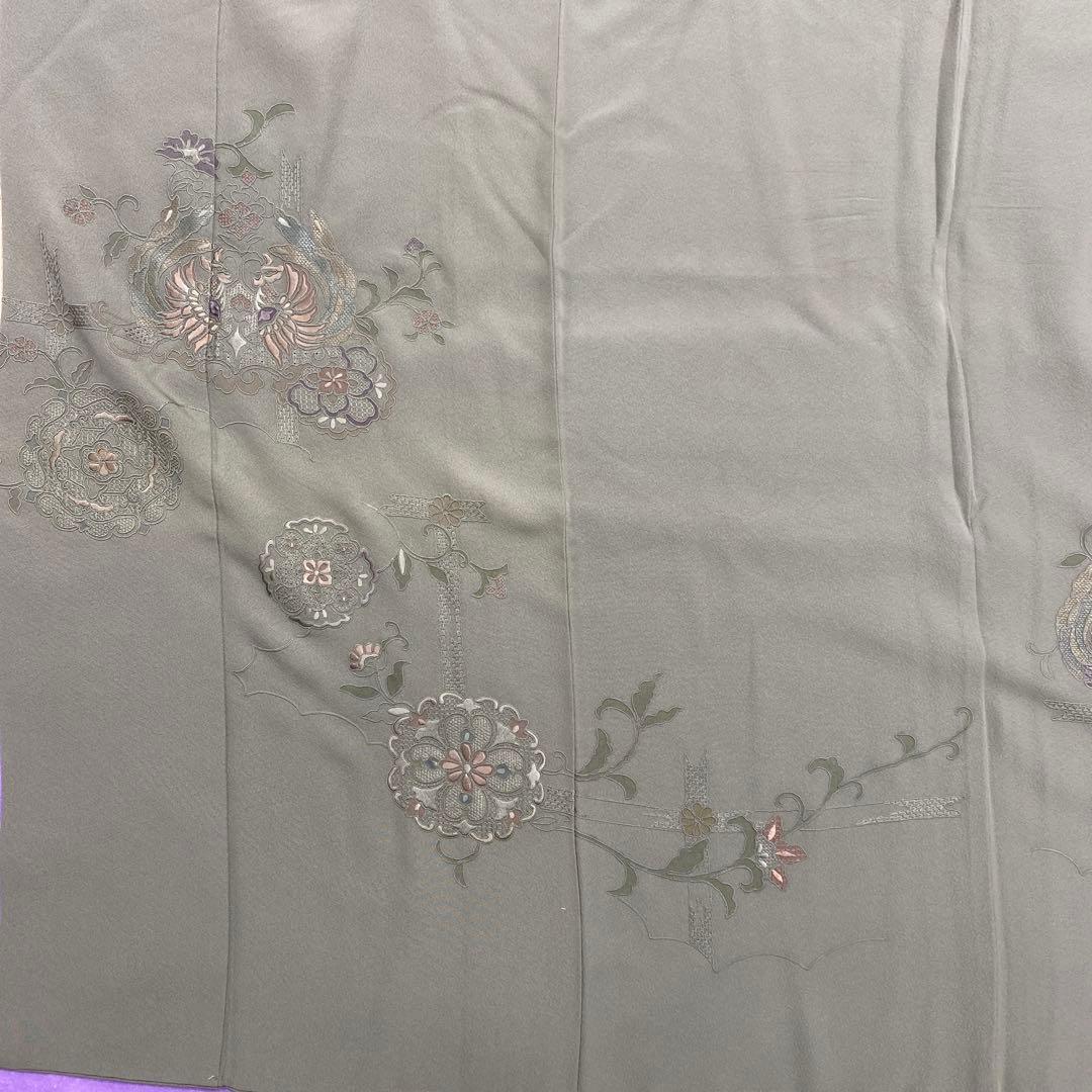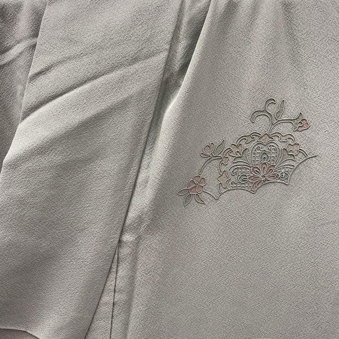 6744 汕頭刺繍 付下 着物 正絹 薄灰緑