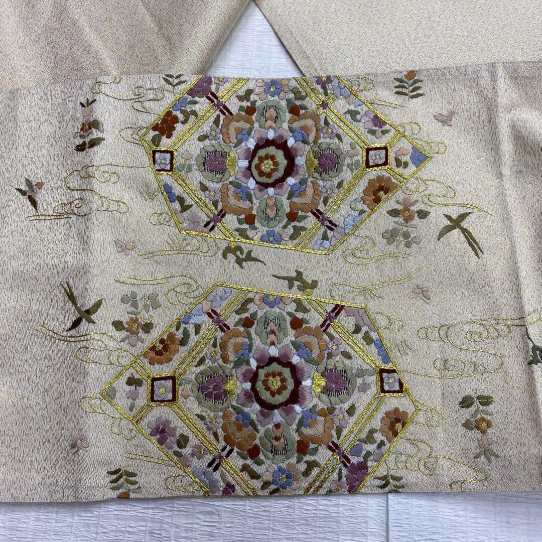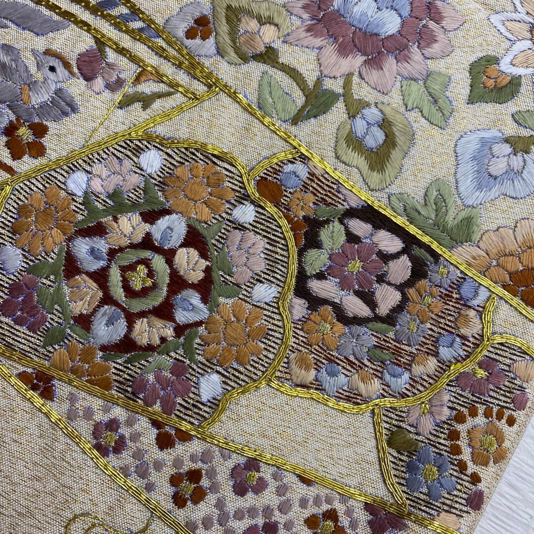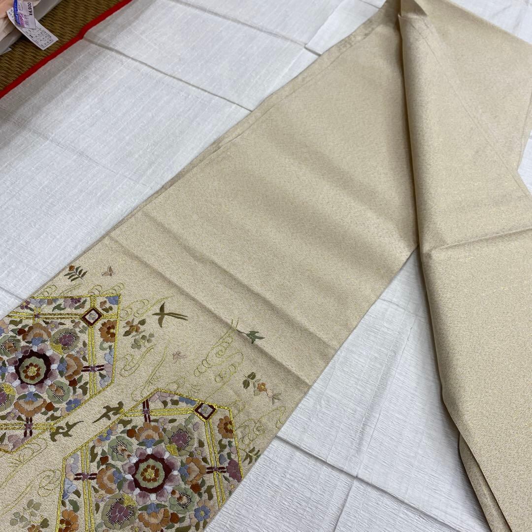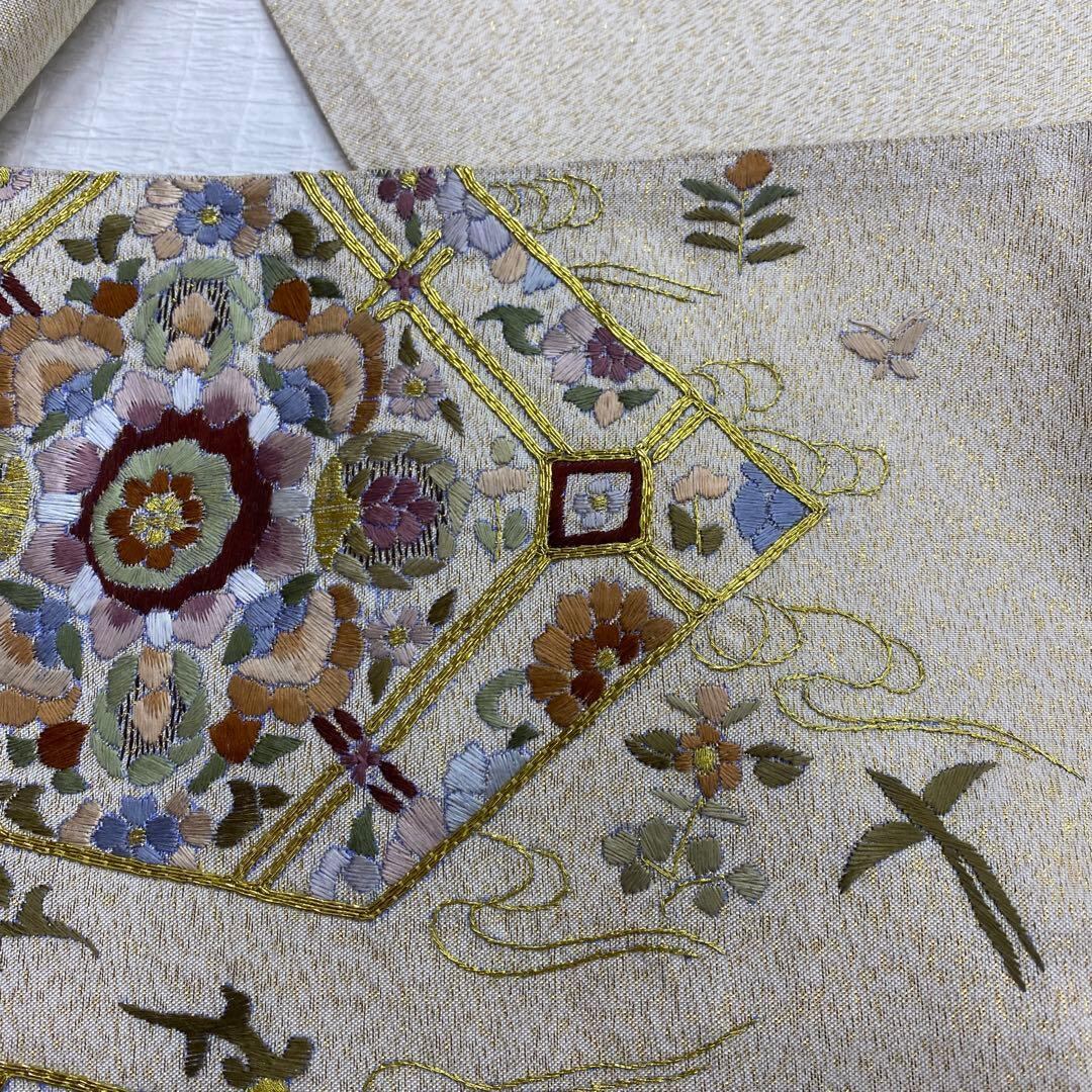 6789 刺繍 袋帯 正絹 六通 訪問着 色無地 付下 ベージュ ラメ 金糸
