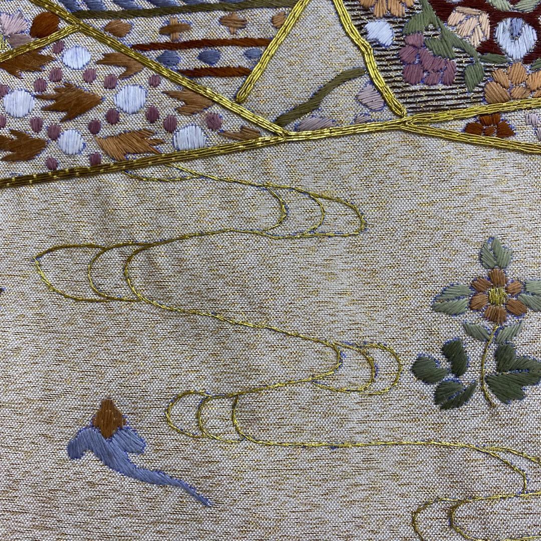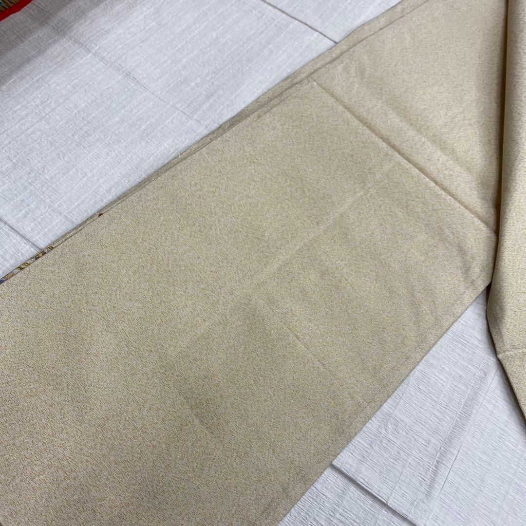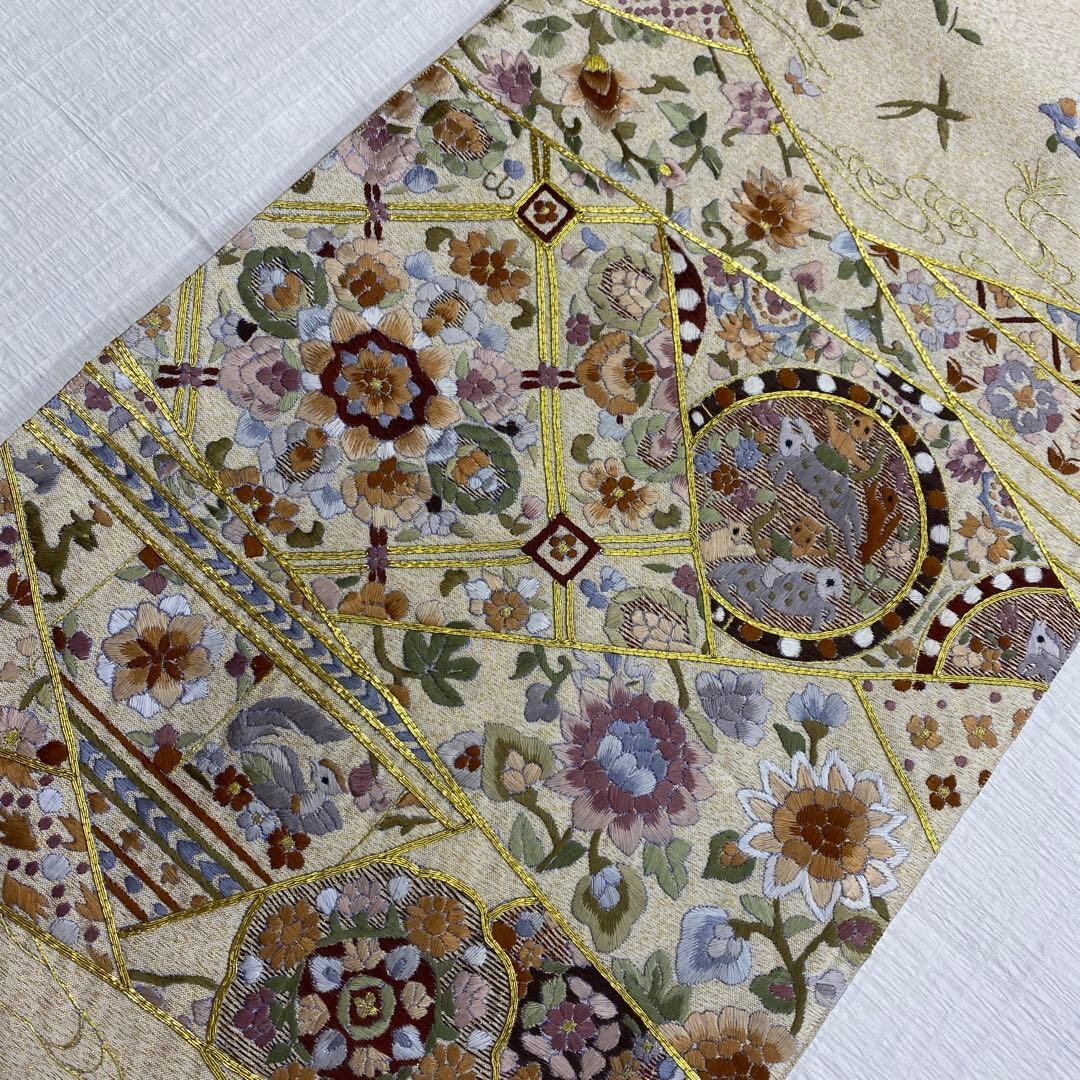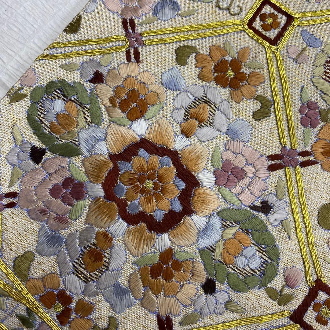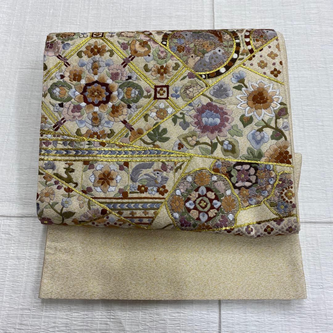 6789 刺繍 袋帯 正絹 六通 訪問着 色無地 付下 ベージュ ラメ 金糸