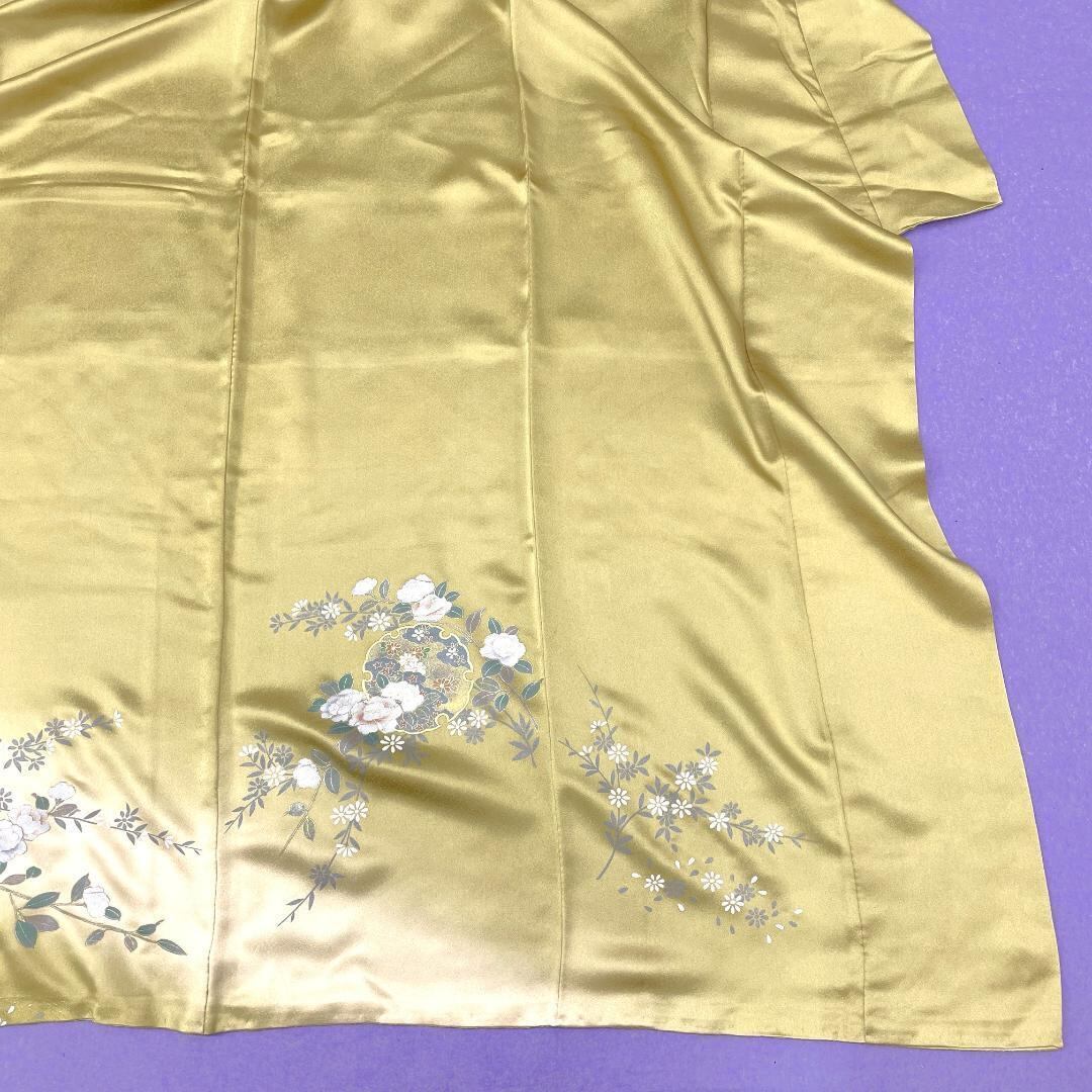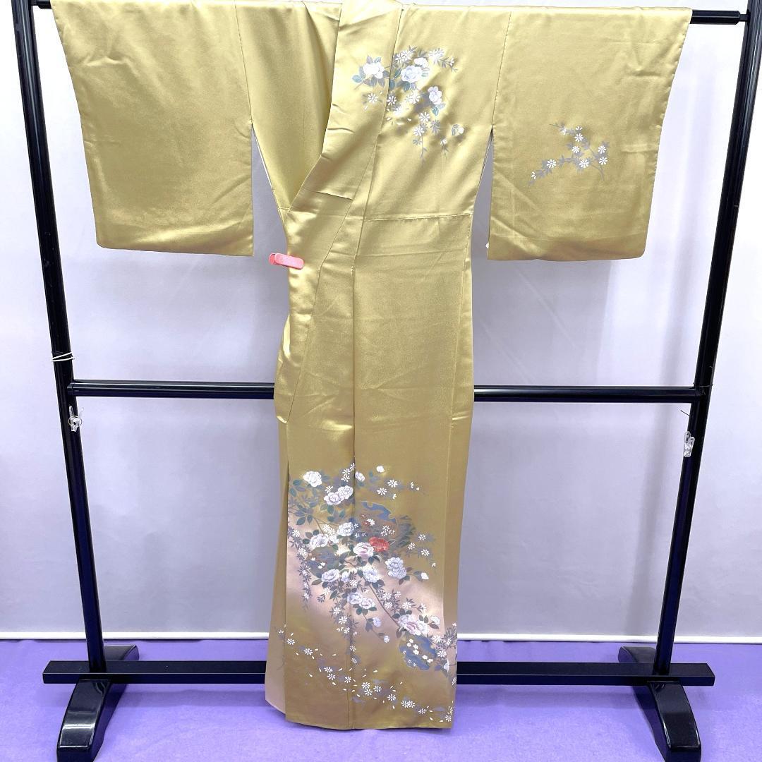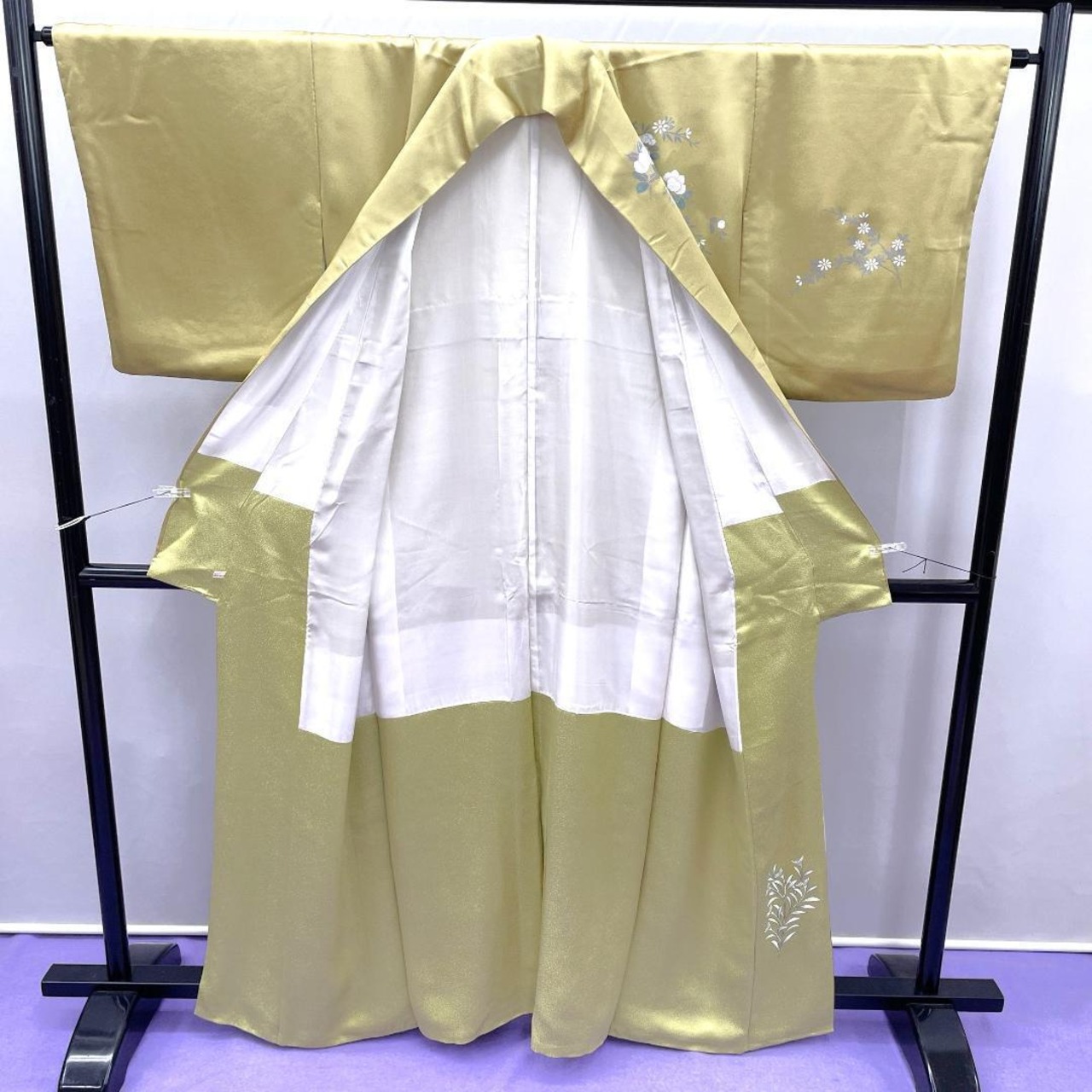 ★4166★ 灰み黄色 桑染色 訪問着 花柄刺繍 袷