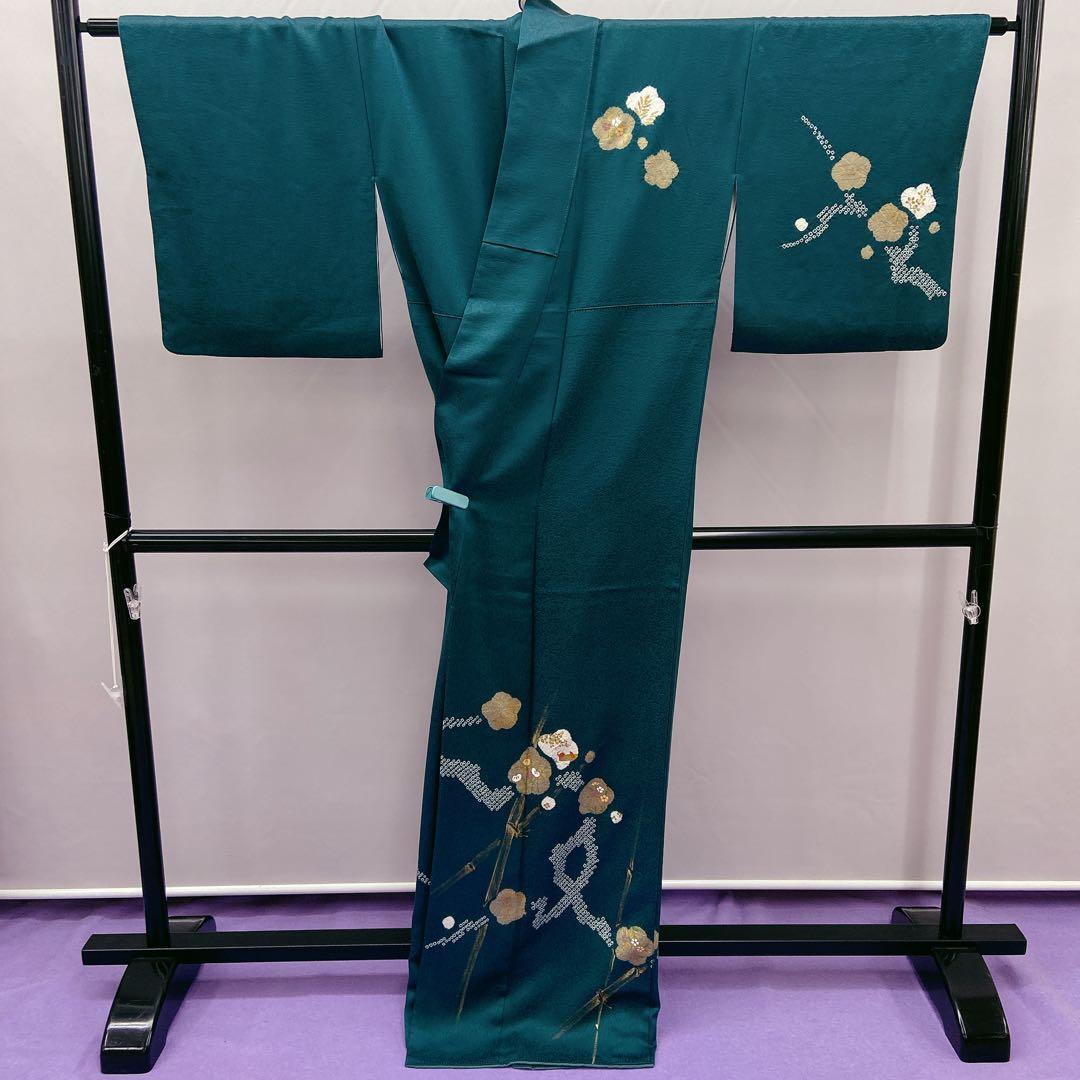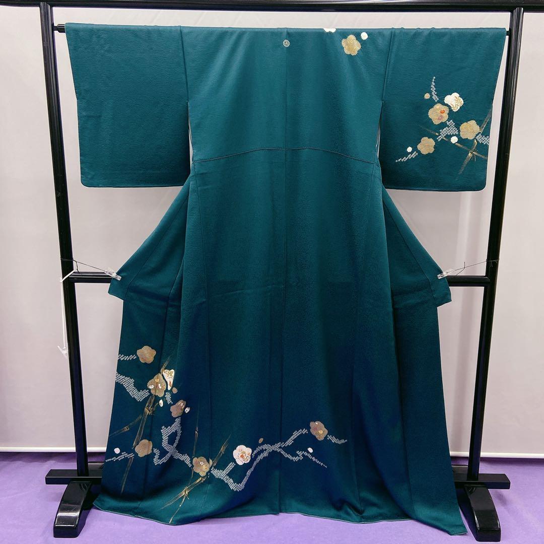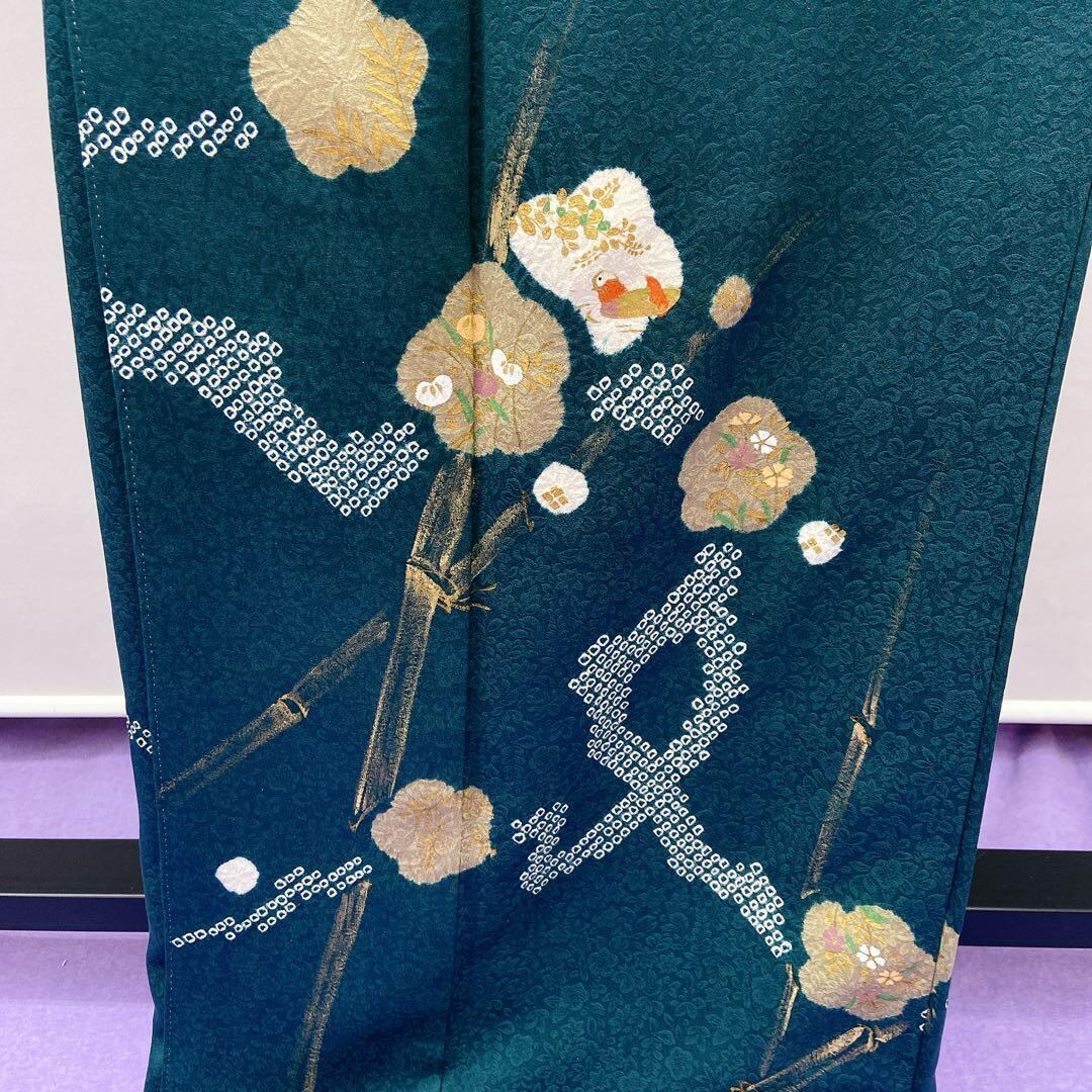 7419 付下げ訪問着 竹 絞り 箔 緑
