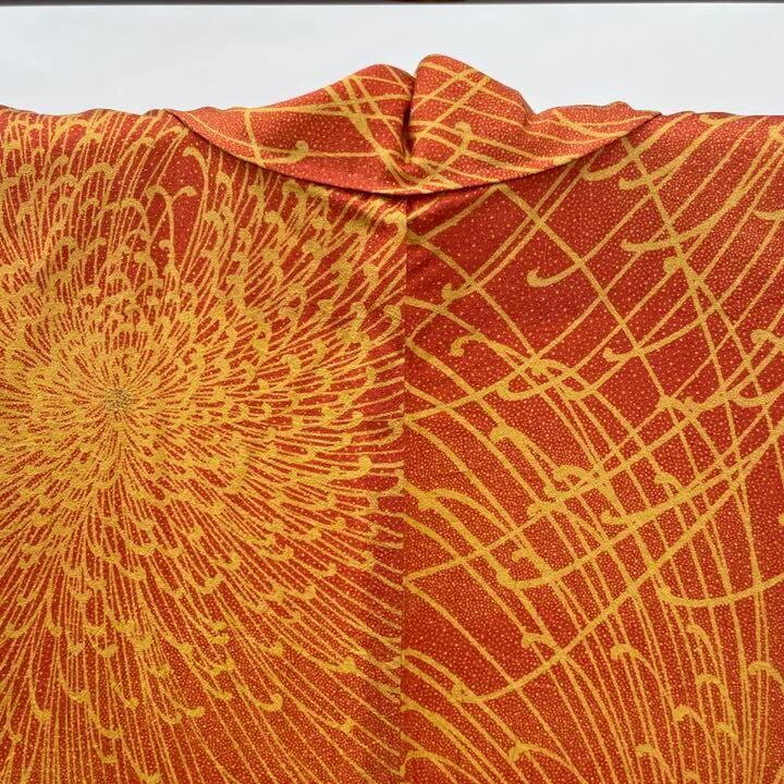 SBY20単衣 着物 正絹 オレンジ 赤 菊 おしゃれ 上品 小紋