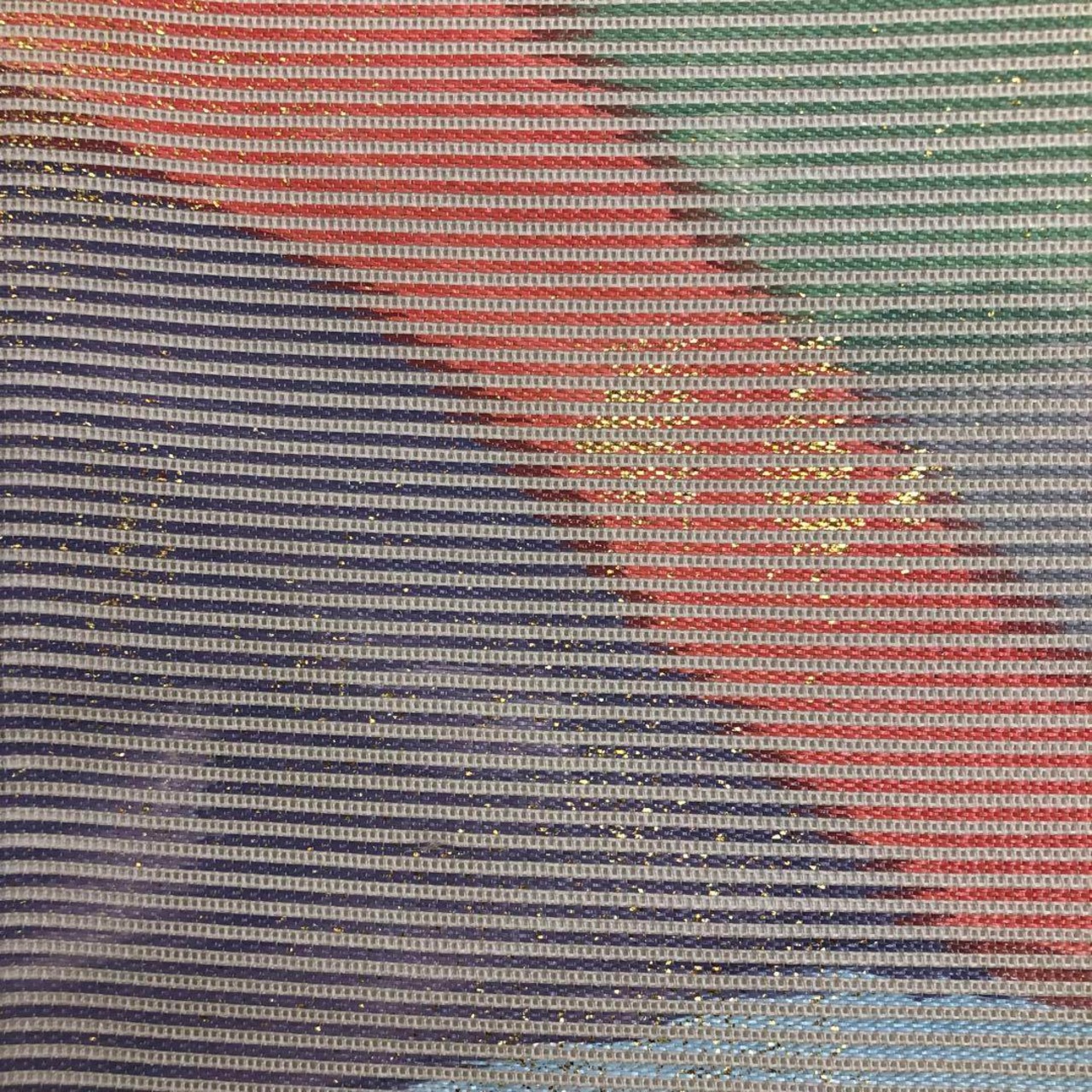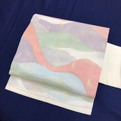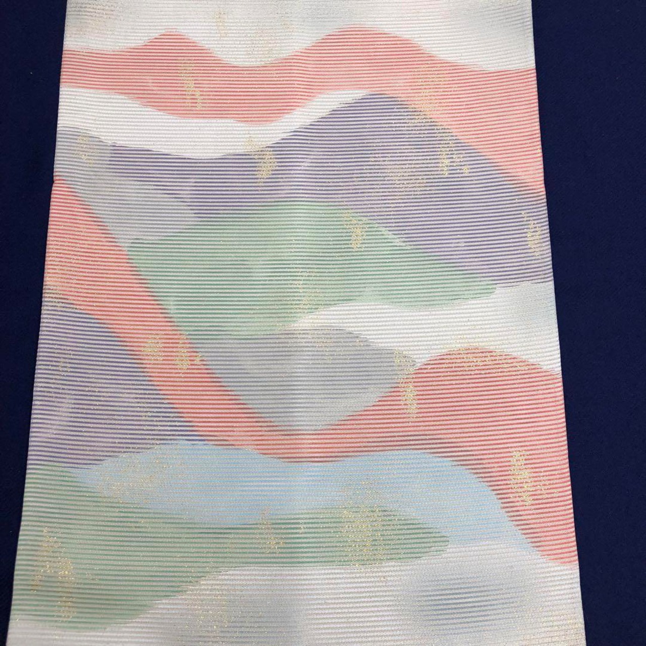 ◆33◆夏 名古屋帯 オフホワイト 緑 朱 紫 水色 金 グレー