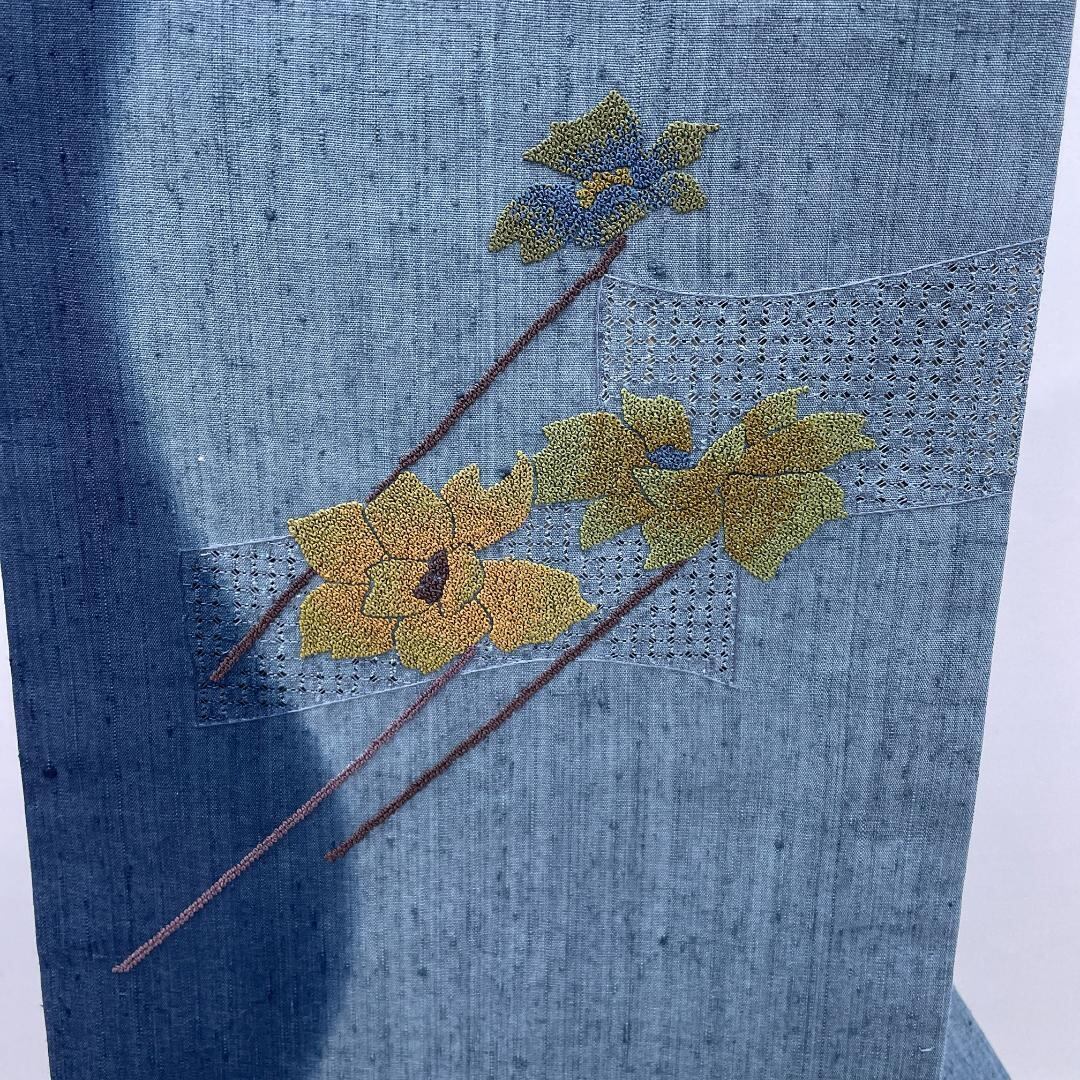 ★1806★ 名古屋帯 相良刺繍 グレーみ紺色 花 お太鼓柄 なごや帯