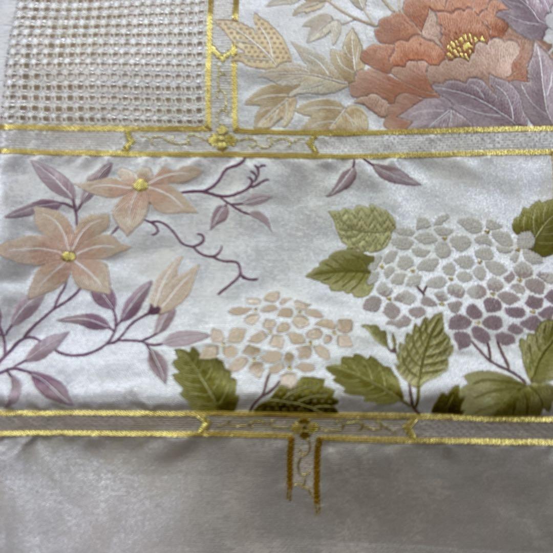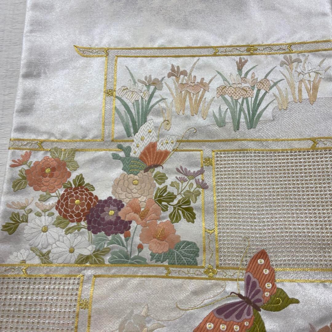 4953 スワトウ刺繍 花 蝶 袋帯 正絹 六通 訪問着 振袖 色無地